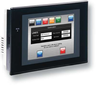 Touch screen HMI, 5.7 inch, TFT, 256 colors (32,768 colors for .BMP/.JPG), 320×240 pixels, 2 x RS-232C ports, Ethernet (10/100 Base-T), 24 VDC, 60MByte memory, 24 VDC, black case